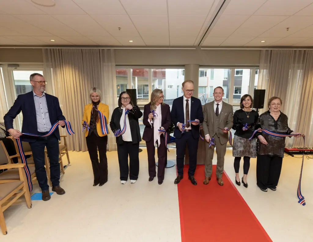Það voru þau Sigurður Hreinsson, verkefnastjóri framkvæmdanna, María Fjóla Harðardóttir, forstjóri Hrafnistu, Inga Sæland fyrrum félags- og húsnæðismálaráðherra, Alma D. Möller, heilbrigðisráðherra, Kjartan Már Kjartansson, bæjarstjóri Reykjanesbæjar, Aríel Pétursson, formaður Sjómannadagsráðs, Þuríður Elísdóttir, forstöðumaður Hrafnistu á Nesvöllum, og Sigríður Bjarnadóttir, íbúi á nýja heimilinu á Nesvöllum sem klipptu á borðann við opnunina í dag.